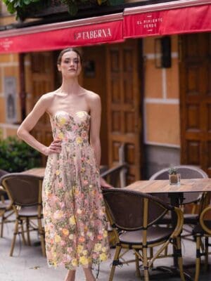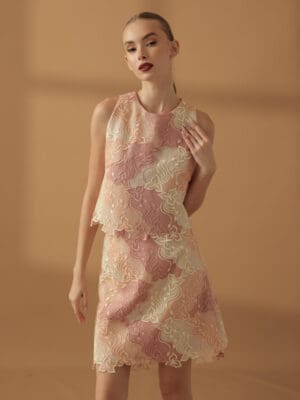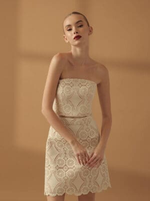 Cream silk coordinated corseted cropped top with bias cut midi skirt embellished with 3d floral laser cut details