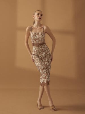 Cream and chocolate brown floral lace coordinated corseted cropped top with straps and pencil cut midi skirt