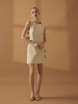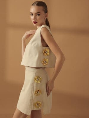 Cream denim coordinated cropped semi-haltered top with mini skirt embellished with gold floral accents