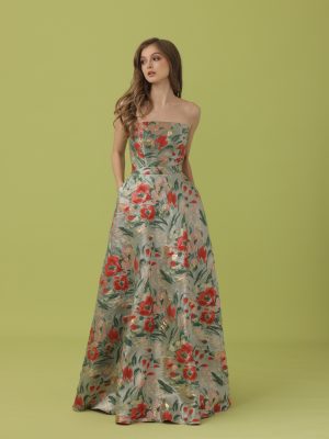 Sage, champagne, moss green and crimson red floral silk brocade coordinated corseted tube top with coordinated full bias cut skirt with secret side pockets