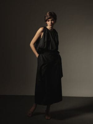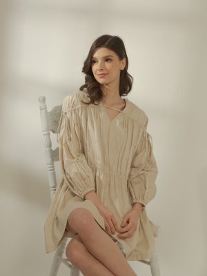 Nude ruched top with sabrina neckline and puff sleeves with coordinated wrap skirt in Egyptian cotton