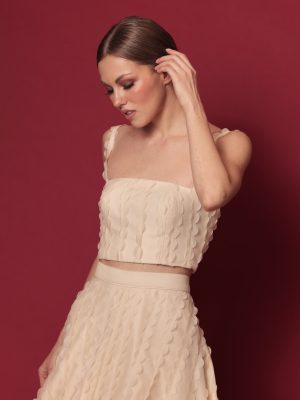 Tan and white floral lace corseted midi dress with pencil cut skirt and white gross grain bows as straps
