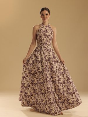 Burgundy and cream floral coordinated haltered top and full bias floor length skirt with secret side pockets