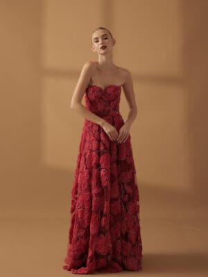 Cream silk coordinated corseted cropped top with bias cut midi skirt embellished with 3d floral laser cut details