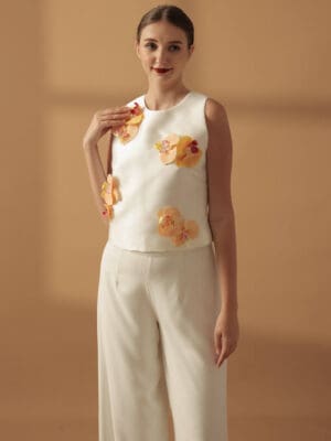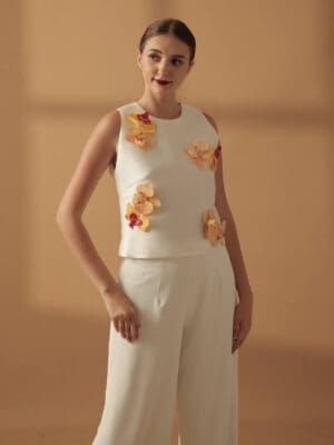 Coffee floral embroidered cropped top with trimming details as straps and full bias cut skirt with secret side pockets