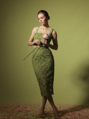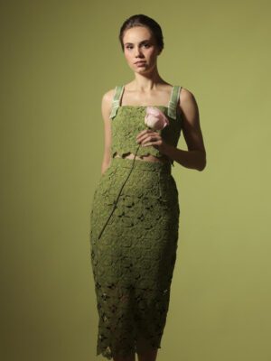 Chartreuse guipure floral lace coordinated corseted cropped top with straps and pencil cut midi skirt with sheer detail