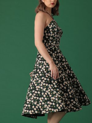 Haltered shirt dress in lilac and white in toile du jouy with bias cut midi length skirt with secret side pockets