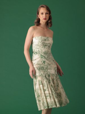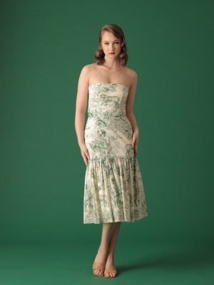Greyish blue toile du jouy coordinated haltered top and full bias floor length skirt with secret side pockets
