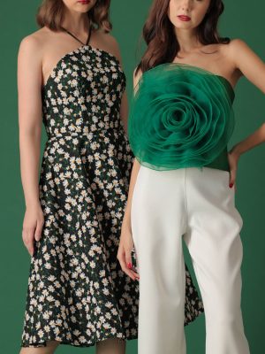 Green and white houndstooth tweed coordinated corseted cropped top and skirt with gold button details