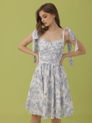 Grey and pink toile du jouy coordinated haltered top with bow detail at the back and wide leg pants with secret side pockets