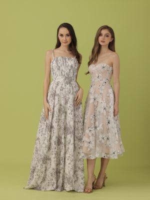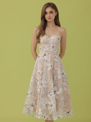 White eyelet corseted tube top with floral trimmings with coordinated pencil cut midi skirt with sheer detail