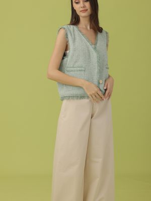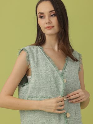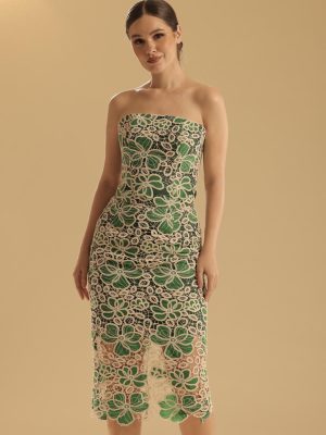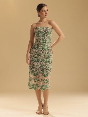 Emerald green and cream floral eyelet coordinated cropped tube top and pencil cut midi length skirt with sheer detail