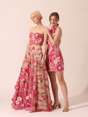 Silver silk gazar semi-haltered sheath mini dress embellished with 3D floral lace appliques with faux ostrich feathers