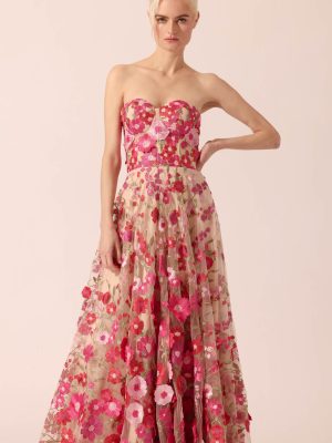 Powder blue and white floral lace corseted midi dress with pencil cut skirt with sheer detail and white gross grain bows as straps