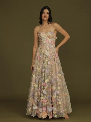 Wine red multi-coloured floral lace corseted long gown with white gross grain as straps and full bias cut skirt