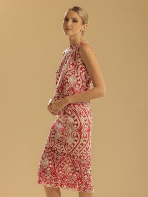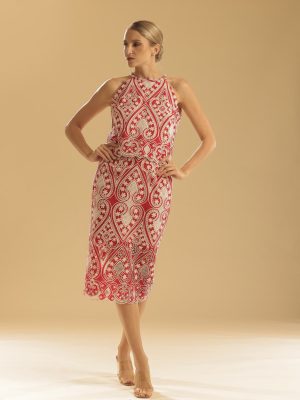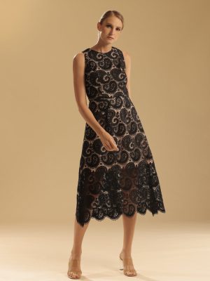 Black paisley/ floral lace midi dress with semi-haltered neckline and A-line skirt with sheer detail (on nude lining)