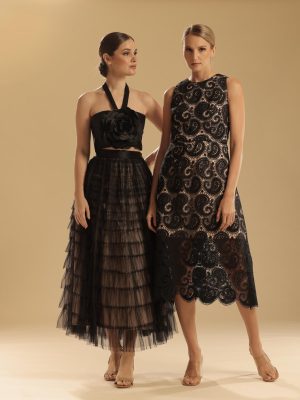Black French Chantilly lace mini dress on nude lining; with long sleeves and A-line skirt embellished with floral lace appliques