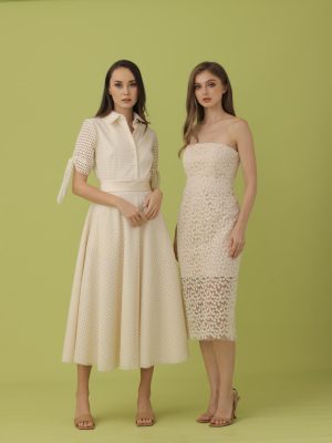 Midnight blue and white floral eyelet semi-haltered top with coordinated A-line skirt with sheer detail