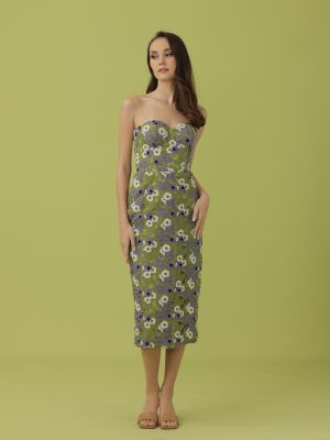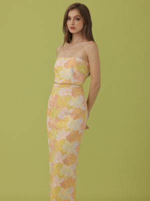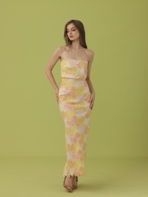 Yellow, peach and ivory floral lace corseted tube top with coordinated pencil cut ankle length skirt
