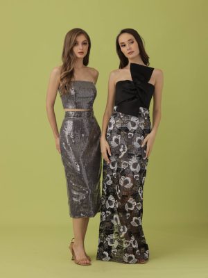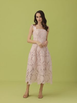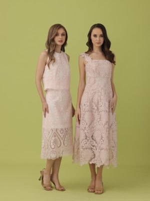 Baby pink and white floral eyelet semi-haltered top with coordinated A-line midi skirt with sheer detail