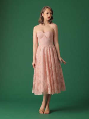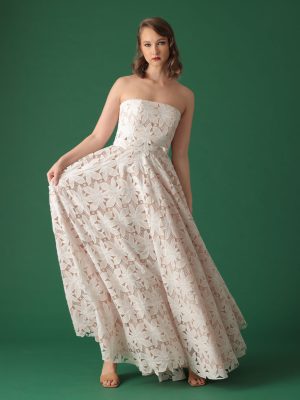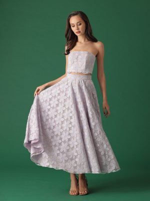 White floral lace coordinated cropped tube top and full bias floor length skirt with secret side pockets