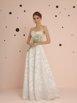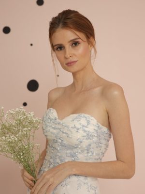 Powder blue and white floral embroidered tulle long gown with corseted ruched bodice and full bias gathered skirt