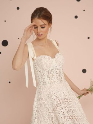 White floral lace on blush silk ankle length dress with corseted bodice and gross grain bows; with full bias gathered skirt