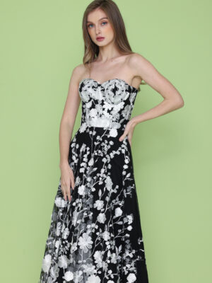 Powder blue and white floral crochet lace coordinated cropped corseted top with straps and full bias cut skirt with secret side pockets