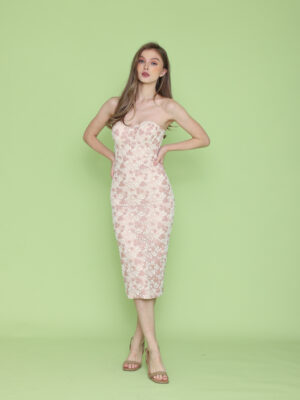 Butter yellow floral guipure lace coordinated cropped top with scoop neckline and pencil cut midi skirt with sheer detail