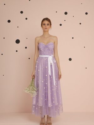 Lilac floral tulle embroidered tea length dress with sweet heart neckline and ruched bodice; full bias gathered skirt with white gross grain sash