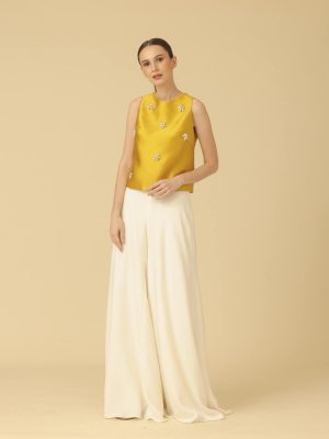 Semi-haltered Mikado silk top in Marigold with embellished flowers (in pearls and rhinestones)
