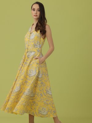 Marigold toile du jouy haltered shirt dress with midi length and secret side pockets