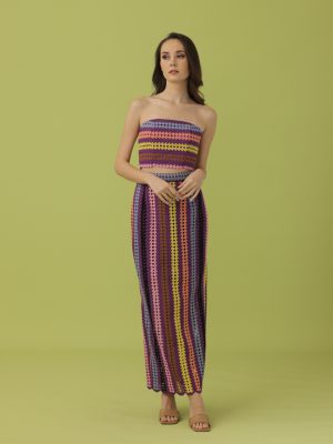 Purple multi-coloured lace corseted cropped top with coordinated pencil cut ankle length skirt with sheer detail