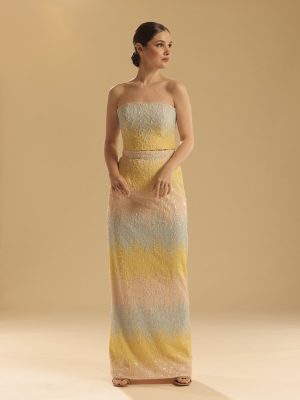 Dusty blue ombre 3D lace coordinated tube top and bias cut midi length skirt with secret side pockets