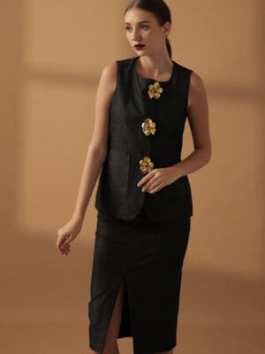 Dark Denim coordinated tailored top with gold floral accents and pencil cut midi skirt with center front slit
