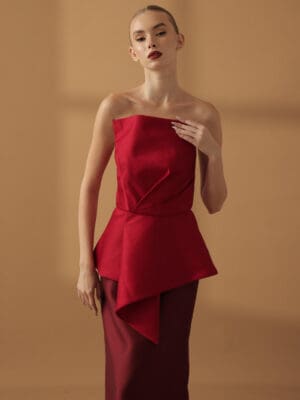 Wine silk coordinated corseted peplum statement top with cascading detail and pencil cut floor length skirt