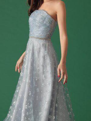 Dusty blue embellished tulle tube midi dress with ruched bodice and bias cut skirt with rhinestone detail