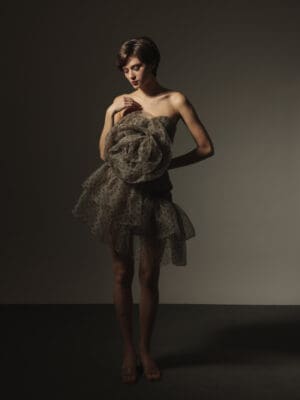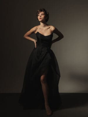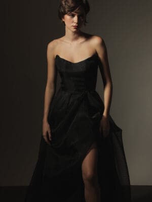 Black silk organdy polka dots corseted bustier long gown with draped skirt with rosette and side slit details