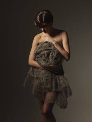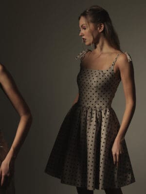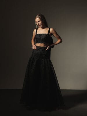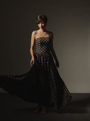Black silk organdy polka dots coordinated corseted cropped top with black velvet bow details and drop waist bias cut floor length skirt