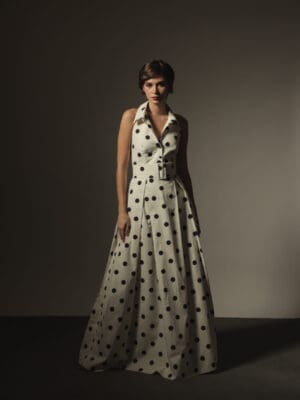 White and black polka dots haltered shirt dress with bias cut floor length skirt with secret side pockets