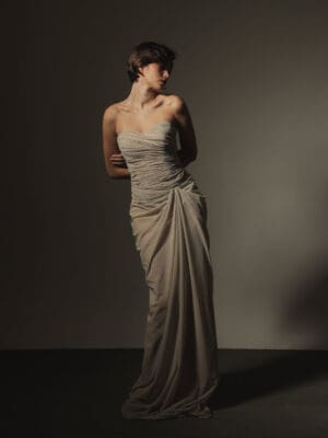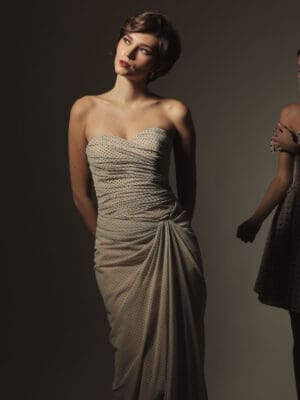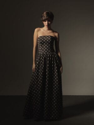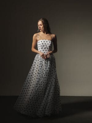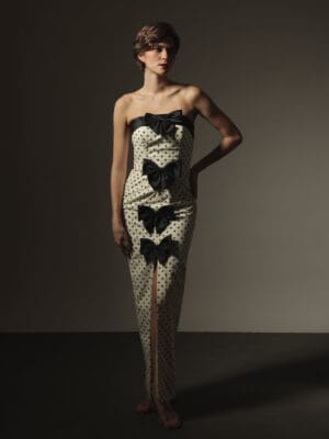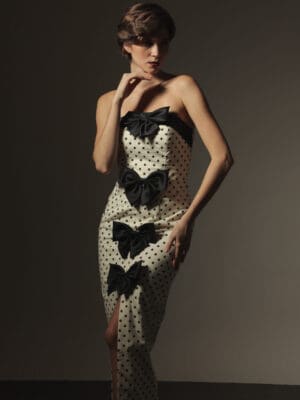 White and black polka dots corseted bustier long gown with bow details, pencil cut skirt and center front slit