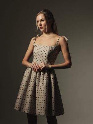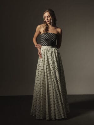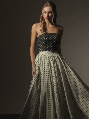 Black and white polka dots coordinated corseted bustier top and full bias gathered skirt with secret side pockets