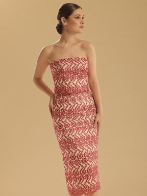 Red and white floral eyelet coordinated tube top with flap detail and pencil cut midi skirt with sheer detail
