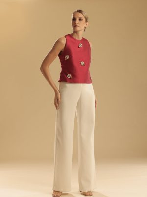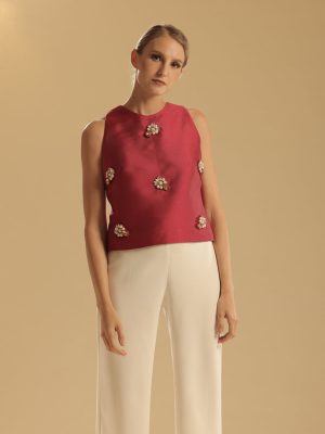 Red silk coordinated corseted bustier top with mini A-line skirt embellished with floral appliques with beads