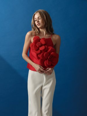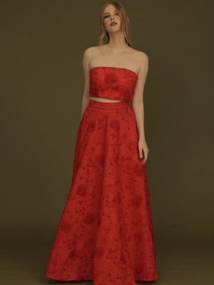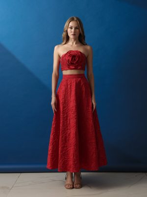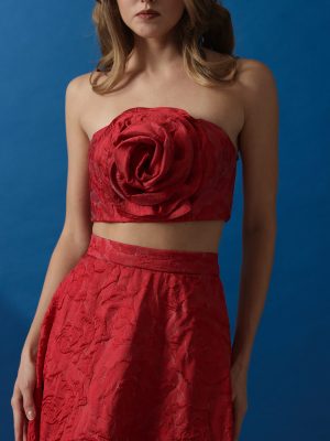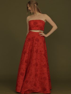 Red floral textured tulle coordinated corseted bustier cropped top with full bias cut skirt with secret side pockets