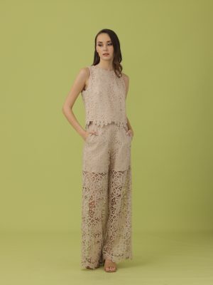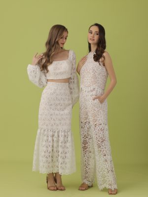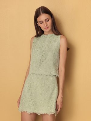 Sage green floral lace coordinated semi-haltered cropped top with semi A-line skirt with sheer detail