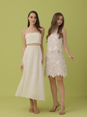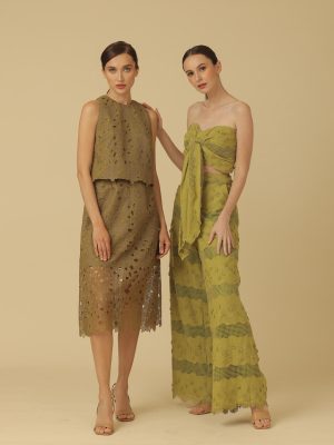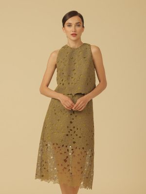 Olive green floral lace coordinated semi-haltered top and A-line midi length skirt with sheer detail