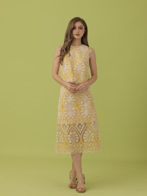 White and cobalt blue sunflower lace coordinated corseted top with spaghetti straps and pencil cut midi skirt with sheer detail
