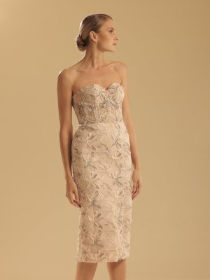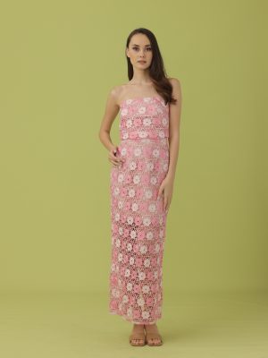 Pink and white floral guipure lace coordinated tube top and pencil cut ankle length skirt with sheer detail