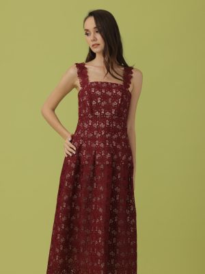 Dusty blue and coffee floral lace coordinated modern Filipiniana top and pencil cut midi skirt with sheer detail